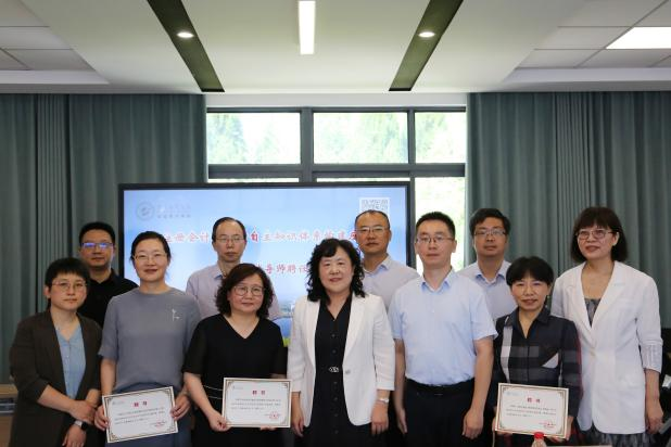 在校外实践导师聘任仪式中,社会审计党总支书记况广收为苏亚金诚会计师事务所合伙人薛婉如、天衡会计师事务所(特殊普通合伙)合伙人程正凤、中兴华会计师事务所江苏分所质控总监王立红、南京南审希地会计师事务所主任会计师沈红、南京鹏宇联合会计师事务所所长彭征安五位校外实践导师颁发聘书。