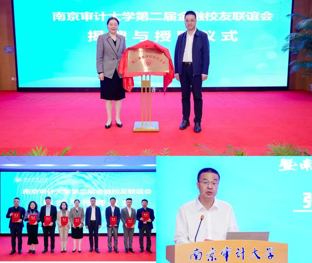 南京审计大学校友工作办公室主任张成宣读了第二届金融校友联谊会换届的批复。南京审计大学副校长李乾文与新任执行会长王庆共同为“第二届金融校友联谊会”揭牌,并为秘书处代表颁发聘书,标志着新一届金融校友联谊会正式启航。