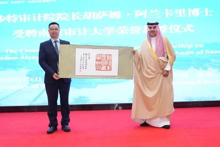 校党委书记董必荣主持受聘仪式,并宣读《关于授予沙特审计院院长胡萨姆·阿兰卡里博士荣誉教授学衔的决定》。董必荣表示,沙特审计院院长阿兰卡里博士到访并受聘为我校荣誉教授必将成为南京审计大学发展历程中的重要篇章。我们将继续在中国审计署的指导下,与沙特审计行业加强交流互鉴,共同推动审计事业的发展!