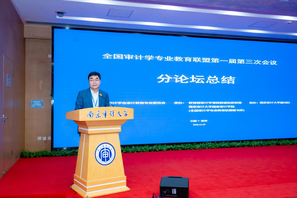 11月15日上午,全国审计学专业教育联盟第一届第三次会议开幕式在南京审计大学举行,南京审计大学党委书记董必荣致欢迎辞。他指出,当前文科迎来历史最佳机遇期,构建中国自主知识体系是响应党中央战略部署的关键任务。他介绍了南京审计大学在建构中国审计学自主知识体系、推进原创性教材建设和讲好中国审计故事方面的探索与实践。他号召联盟成员在体系构建、师资赋能和产教融合三方面协同发力,共建共享,推动中国审计教育高质量发展。南京审计大学党委常委、副校长陈冬华主持会议。