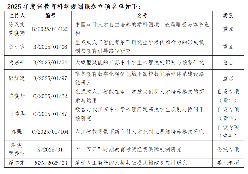 本次立项课题的研究范围多集中于审计特色、高等教育治理、人才培养模式创新等优势领域,体现了我校教育科研服务国家战略需求与学校中心工作的鲜明导向。