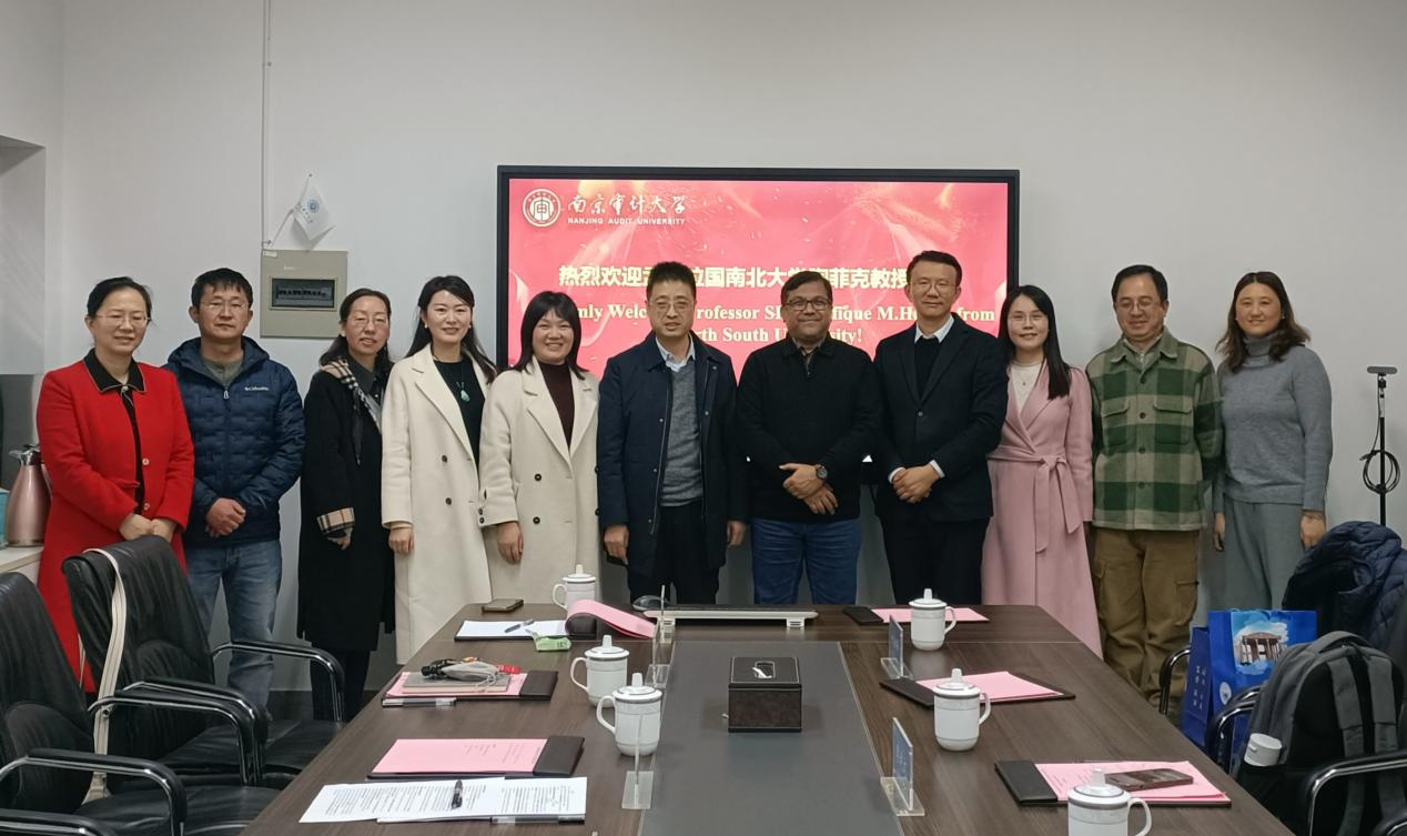 12月17日下午,孟加拉国南北大学南亚政策与治理研究中心主任陶菲克教授访问南京审计大学,并与校党委常委、副校长李乾文及外国语学院领导班子、区域国别研究方向骨干教师举行学术交流会谈。
