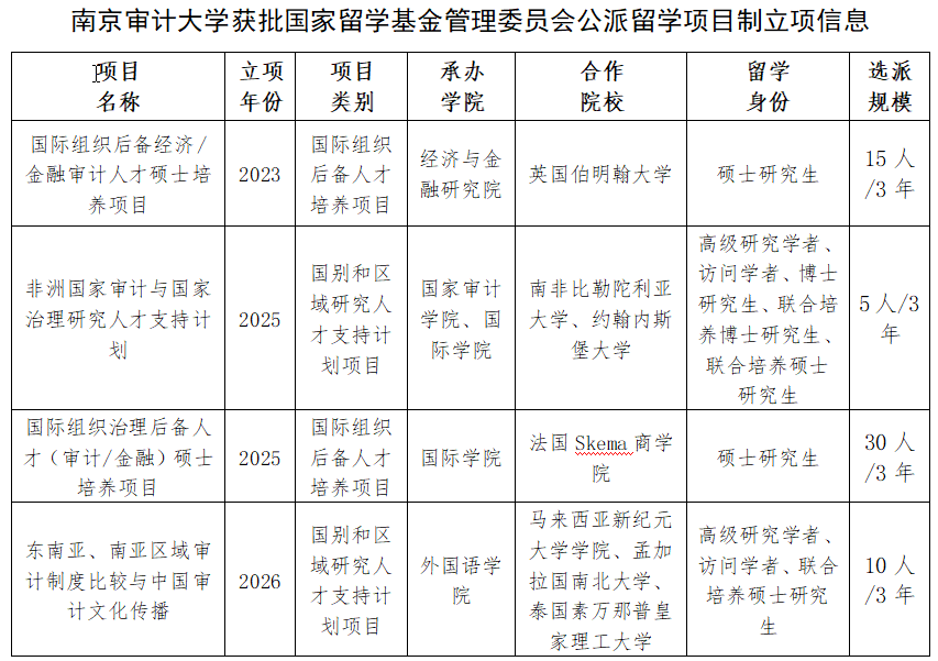 该项目是我校获批的第四个国家留学基金委资助项目。学校将继续依托国家级项目平台,以公派留学项目为重要抓手,聚焦国家战略急需,突出审计特色,深化高水平国际合作,为培养具有全球胜任力的复合型人才、助力师生走向国际舞台持续贡献力量。