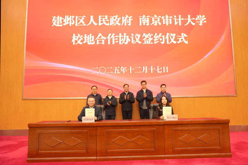 我校副校长任志成与建邺区副区长袁婷代表双方签署校地合作协议。双方明确,“人工智能审计研究院(江苏)”将落户建邺高新区。我校党委书记董必荣、南京市财政局局长林峥、南京市审计局局长姚瑞平、南京市科学技术局一级调研员姚建虎、建邺区委副书记、区长贾晨共同见证。