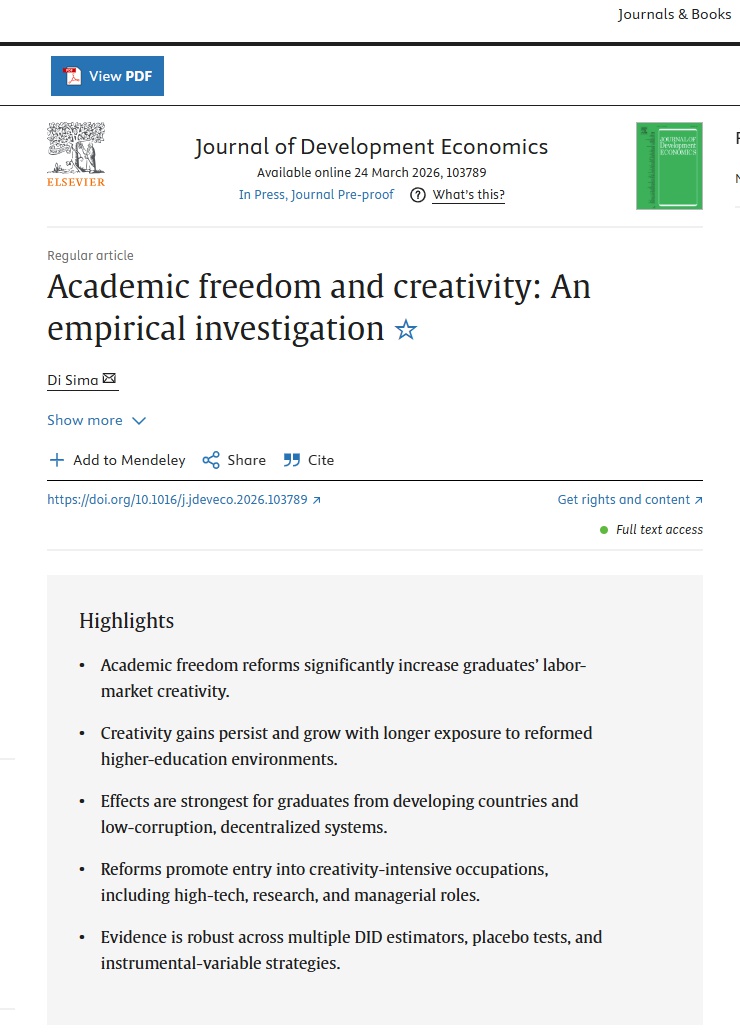 近日,我校教师司马帝的独作论文“Academic freedom and creativity: An empirical investigation”在国际期刊Journal of Development Economics上发表。