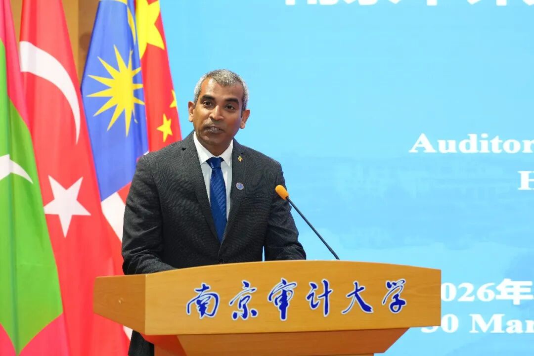 马尔代夫审计署审计长侯赛因・尼亚兹教授分享了公共部门问责制研究的三阶段知识框架,并强调了实践应用的重要性。他希望以此次受聘为纽带,携手推动公共部门审计事业发展,深化双方在审计教育方面的交流。