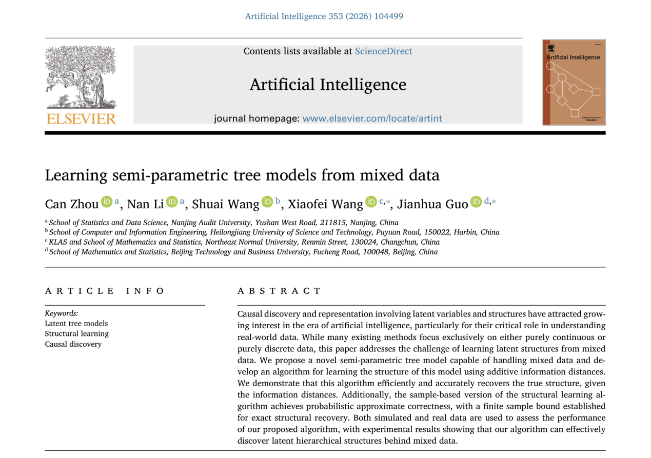 近日,南京审计大学统计与数据科学学院讲师周灿、李南,联合黑龙江科技大学讲师王帅、东北师范大学教授王晓飞及北京工商大学教授郭建华,共同完成的学术论文“Learning Semi-parametric Tree Models from Mixed Data” 已在线发表于人工智能领域顶级期刊Artificial Intelligence (AIJ)。