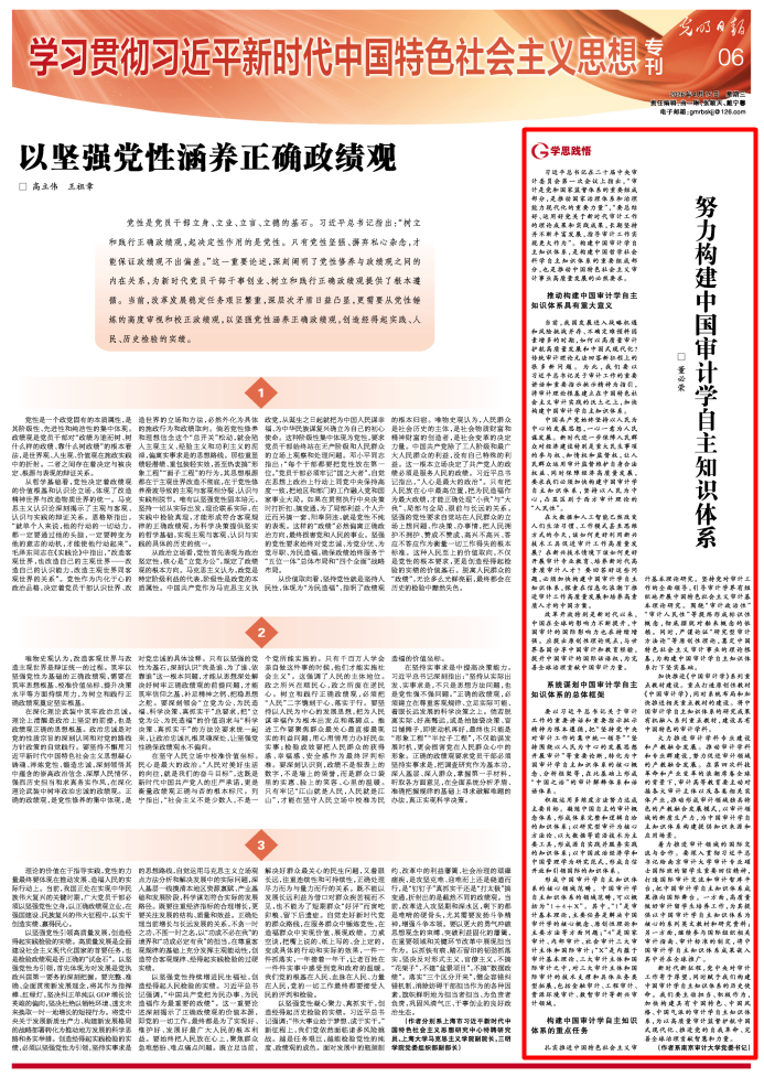 扎实推进中国特色社会主义审计基本理论研究。坚持党对审计工作的全面领导,引导审计学界有组织地开展中国特色社会主义审计基本理论研究。围绕“审计政治性”“审计人民性”等提炼形成标识性概念,彻底摆脱对舶来概念的依赖。同时,严谨论证“研究型审计方法论”等原创性理论,奠定中国特色社会主义审计事业的理论根基,为构建中国审计学自主知识体系打下坚实基础。